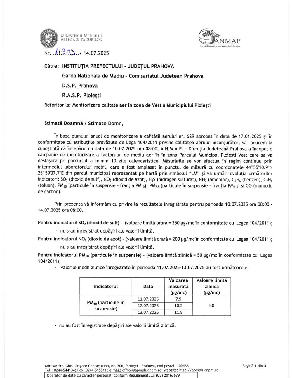 „Agenția pentru Protecția Mediului Prahova ne-a trimis rezultatele primelor 4 zile de monitorizare a calității aerului realizată de laboratorul mobil al APM în Parcul Municipal Ploiești Vest. Cică «nu s-au înregistrat depășiri ale limitelor legale».