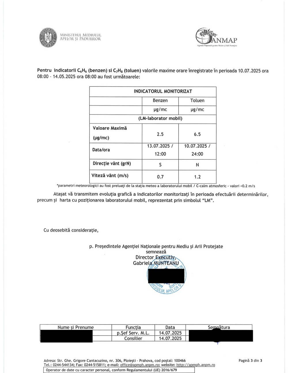 Documentul care a ajuns la Garda de Mediu, Direcția Județeană de Sănătate Publică și Primăria Ploiești cuprinde rezultatele primelor zile de măsurători efectuate de laboratorul mobil amplasat, în cursul săptămânii trecute, în Parcul Municipal Vest.
