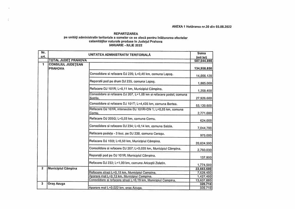 Comitetul Județean pentru Situații de Urgență a aprobat, în această săptămână, lista care va fi trimisă la Guvern, sub forma unui proiect de hotărâre, cu lucrările care ar fi necesare în Prahova, ca urmare a fenomenelor meteo înregistrate în perioada ianuarie – iulie 2022. În total, autoritățile județene spun că ar avea nevoie de aproape 600 de milioane de lei, aproape un sfert de sumă pentru obiective din administrarea Consiliului Județean, iar restul pentru lucrări de infrastructură în 32 de localități.