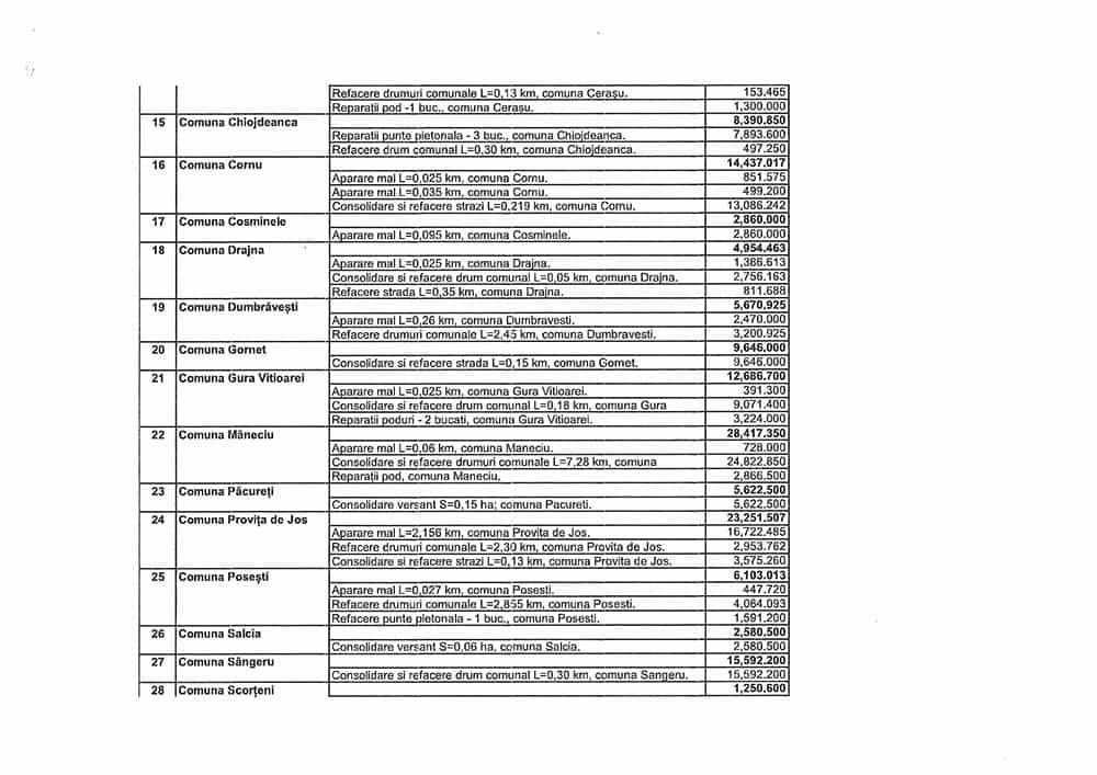 În ceea ce privește lucrările necesare pe raza unor comune, Cerașu a solicitat peste 58 de milioane de lei, mai mult de o treime din sumă fiind necesară, de asemenea, pentru consolidarea unui versant, în timp ce Valea Doftanei speră să primească aproape 33,59 milioane de lei, în special pentru refacerea unor străzi.