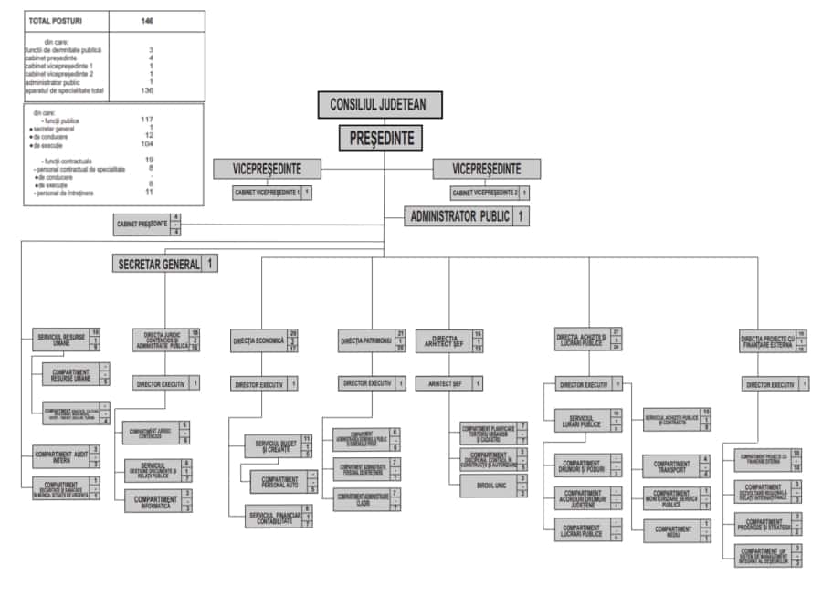 În momentul de faţă, organigrama instituţiei cuprinde 247 de posturi, dintre care 196 de funcţionari publici şi 51 pentru personal contractual, aici fiind incluşi şi preşedintele şi cei doi vicepreşedinţi, cu statut de demnitari, administratorul public şi 6 consilieri personali. În total sunt 28 de funcţii de conducere. În noua formulă, aparatul de specialitate ar urma să ajungă la 146 de posturi, dintre care 117 funcţii publice şi 29 funcţii contractuale sau alte categorii de personal, cuprinzându-le, din nou, pe cele de demnitari şi angajaţi la cabinetele preşedintelui şi vicepreşedinţilor.