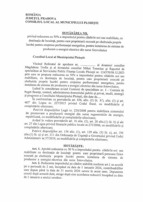 "11 consilieri locali PNL și USR, inclusiv viceprimarul PNL, au votat împotriva proiectului de hotărâre privind reducerea cu 50% a impozitului pentru clădirile noi sau reabilitate, cu destinația de locuință, pentru care proprietarii execută pe cheltuială proprie lucrări pentru creșterea performanței energetice, pentru instalarea de sisteme de producere a energiei electrice din surse fotovoltaice.