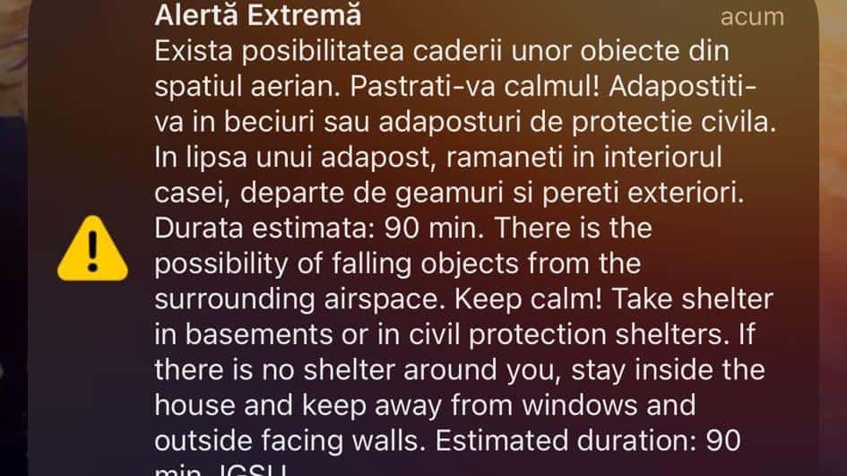 „În cursul nopţii, Inspectoratul General pentru Situaţii de Urgenţă a emis un mesaj RO-Alert pentru populaţia din zona de Nord a judeţului Tulcea după ce, structurile cu rol de apărare şi monitorizare a spaţiul aerian de frontieră au reperat un grup de drone care se îndreptau către ţinte de pe teritoriul ucrainean aflate la graniţă cu România. Astfel, mesajul transmis către populaţie, face un apel la calm, iar în cazul în care cad obiecte din spaţiul aerian, să respecte recomandările de adăpostire şi de autoprotecţie transmise prin mesajul RO-Alert”, transmite ISU Tulcea.