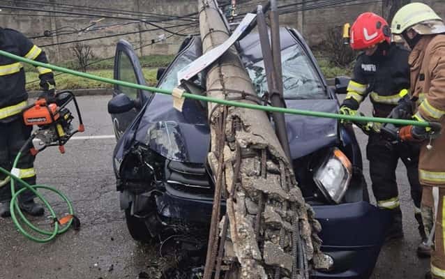 Autoturismul a intrat în coliziune cu un stâlp de pe marginea carosabilului, care, în urma impactului, s-a prăbușit peste mașină.