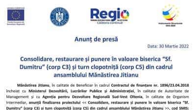 Mănăstirea Jitianu, în calitate de Beneficiar în cadrul Contractul de finanțare nr. 1896/23.04.2018 încheiat cu Ministerul Dezvoltării, Lucrărilor Publice și Administrației, în calitate de Autoritate de Management și cu Agenția pentru Dezvoltare Regională Sud-Vest Oltenia, în calitate de Organism Intermediar, anunță finalizarea proiectului << Consolidare, restaurare și punere în valoare biserica “Sf. Dumitru” (corp C3) și turn clopotniță (corp C5) din cadrul ansamblului Mănăstirea Jitianu >>, cod SMIS: 119855, finanțat prin Programul Operațional Regional 2014-2020, Axa prioritară 5 - Îmbunătățirea mediului urban și conservarea, protecția și valorificarea durabilă a patrimoniului cultural, Prioritatea de investiții 5.1 - Conservarea, protejarea, promovarea și dezvoltarea patrimoniului natural și cultural, Apelul de proiecte POR/2017/5/5.1/2.