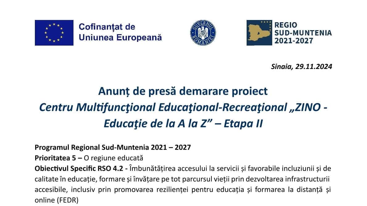 Anunț de presă demarare proiect Centru Multifuncţional Educaţional – Recreaţional „ZINO – Educaţie de la A la Z” – Etapa II