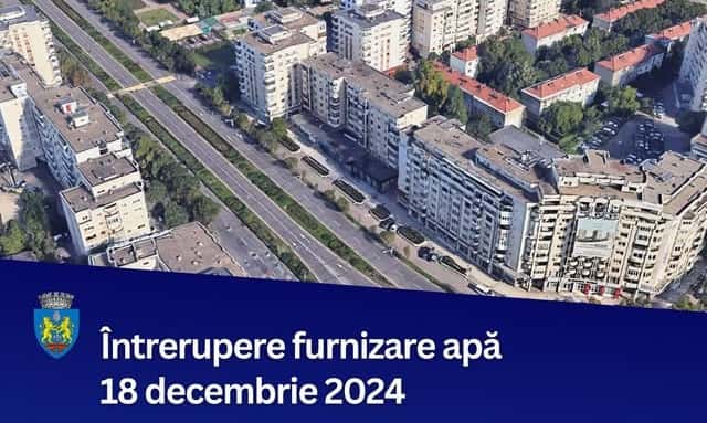 Miercuri, 18 decembrie 2024, în intervalul orar 09:00 - 15:00, Apa Nova va întrerupe alimentarea cu apă pentru lucrări de înlocuire a unei vane în intersecția str.