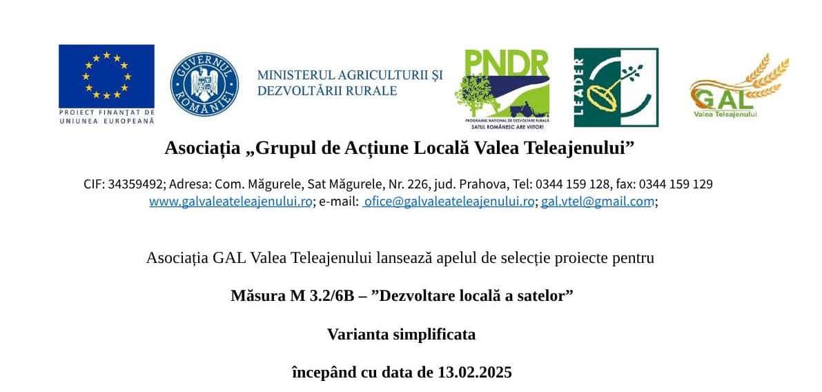 Asociația GAL Valea Teleajenului lansează apelul de selecție proiecte pentru Măsura M 3.2/6B – ”Dezvoltare locală a satelor”