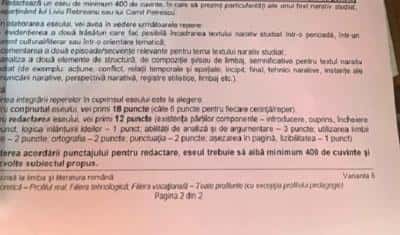 Subiectul al IV-lea a cerut redactarea unui eseu de cel puțin 400 de cuvinte în care să fie prezentate particularitățile unui text narativ studiat aparținând lui Liviu Rebreanu sau Camil Petrescu.
