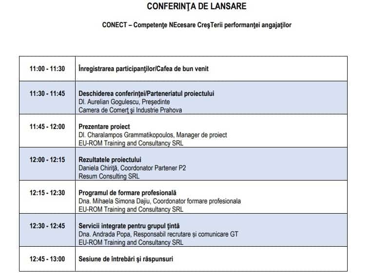 Proiectul va fi lansat miercuri, 9 iunie, printr-o conferință organizată de CCI Prahova, începând cu ora 11.00, la sediul din Ploiești. Agenda evenimentului: