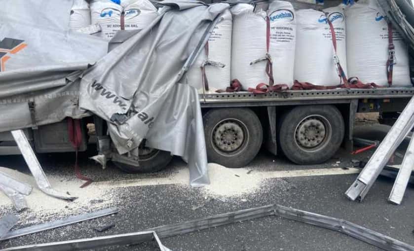 În urma coliziunii, care a avut loc pe sensul de mers Sibiu-Timișoara, câțiva saci în care se afla sulfat de amoniu au cedat și o parte din încărcătură a ajuns pe carosabil.