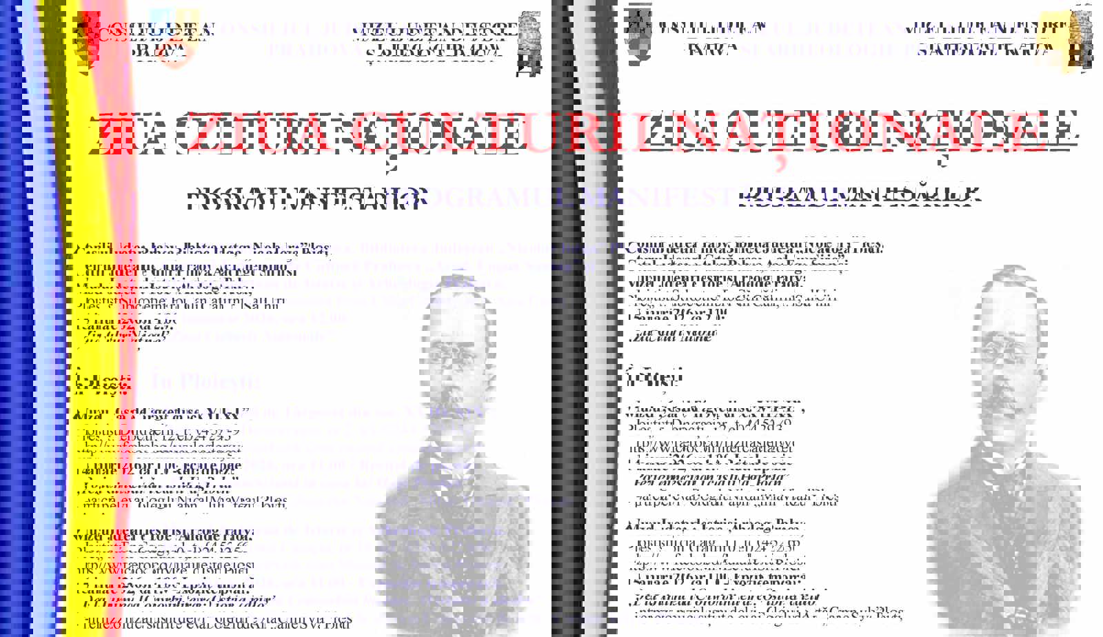 Cu prilejul celei de-a XVI-a ediții a Zilei Culturii Naționale şi împlinirii a 176 de ani de la naşterea poetului naţional Mihai Eminescu, Muzeul Judeţean de Istorie şi Arheologie Prahova şi secţiile sale vă invită în perioada 12 - 18 ianuarie 2026, să participaţi la o serie de evenimente omagiale dedicate personalităţilor culturii prahovene şi naţionale.
