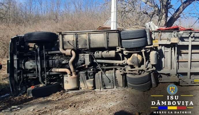 UPDATE. „Traficul se desfășoară dirijat, alternativ, pe DN 72 Găești – Târgoviște, pe raza localității Dragodana, județul Dâmbovița, după ce un autocamion s-a răsturnat parțial pe suprafața de rulare. În urma accidentului, conducătorul auto a fost declarat decedat”, au anunțat și polițiștii de la Infotrafic.