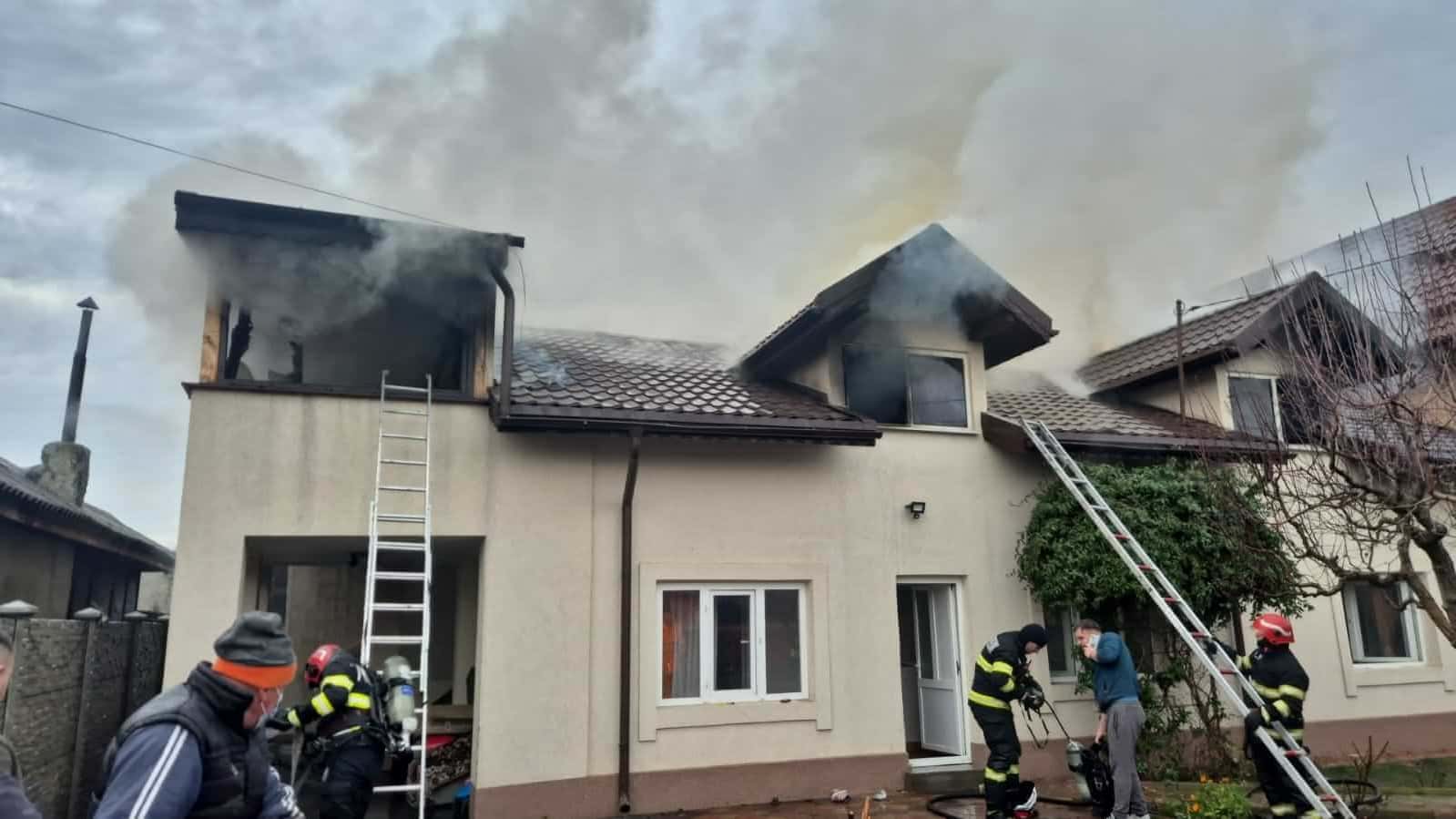 Din primele informații incendiul se manifestă pe o suprafață de aproximativ 150 de metri pătrați de acoperiș, fiind limitată posibilitatea de propagare la restul locuinței.