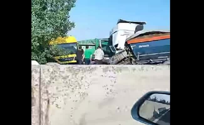 VIDEO 🎦 Accident cu două basculante, pe Centura de Vest a Ploieștiului. Un șofer a rămas încarcerat. Traficul blocat pe un sens