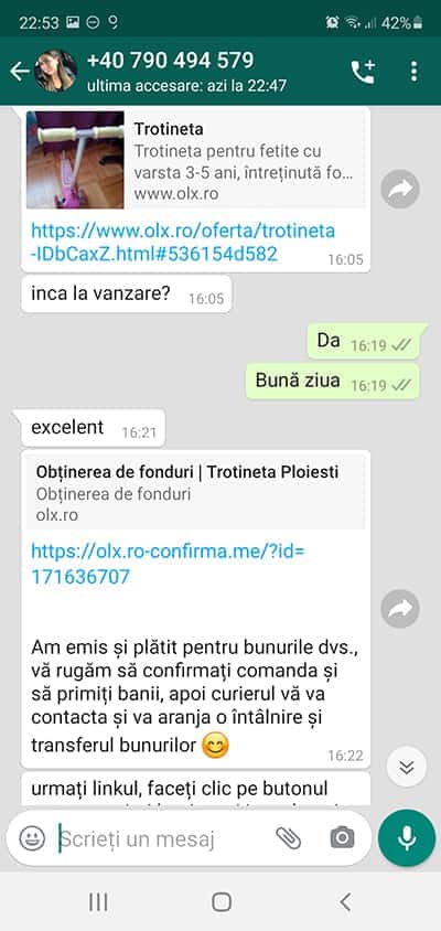 “In cursul lunii octombrie am postat pe site-ul OLX un anunt de vanzare a unei trotinete de copil, lasand vizibil numarul meu de telefon. In ziua de 15.11.20 am fost contactata pe whatsapp de un posibil cumparator care s-a aratat interesat de produs si care fara a solicita alte informatii mi-a mentionat ca a platitit produsul prin intermediul site-ului OLX urmand ca eu sa expediez produsul (conversatie pe care o atasez).