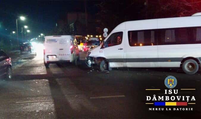 "În jurul orei 18:45 am intervenit în cazul unui accident rutier în localitatea Crevedia, în care au fost implicate 2 autoturisme și un microbuz.