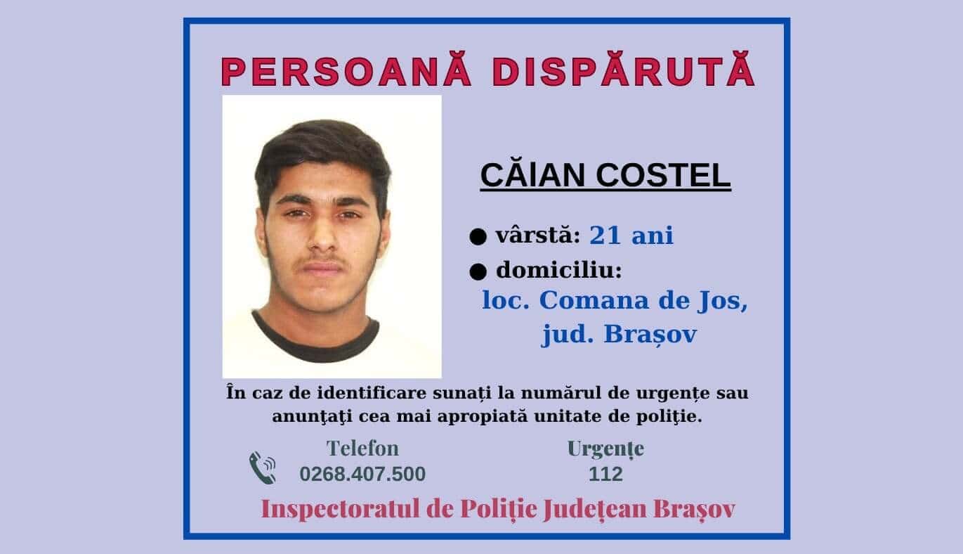 Polițiștii din cadrul Inspectoratului de Poliție Județean Brașov efectuează verificări pentru identificarea lui Căian Costel, după ce, la data de 31.10.2025, acesta ar fi plecat voluntar de la Spitalul Clinic Județean de Urgență Brașov și s-a deplasat într-o direcție necunoscută, fără a reveni la adresa de domiciliu din com. Comana, sat Comana de Jos, jud. Brașov.