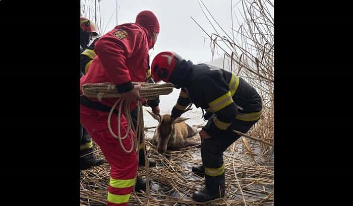 Un cerb blocat pe o întindere fragilă de gheață a fost salvat în urma unei intervenții a pompierilor, cu ajutorul unei bărci pneumatice.