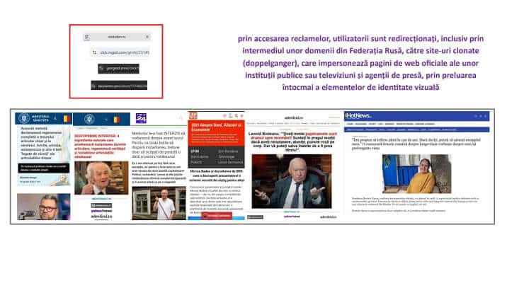 „A fost identificată o rețea de site-uri clonate, care imită întocmai imaginea paginilor oficiale de internet ale unor instituții publice, televiziuni și agenții de presă importante (Guvernul României, Ministerul Sănătății, TVR 1, DIGI24, Hotnews, Adevărul, Libertatea), utilizată pentru promovarea de conținut înșelător, pe teme sociale, politice, economice sau de sănătate în scopul inducerii în eroare a populației și influențării în mod negativ a percepției acesteia.
