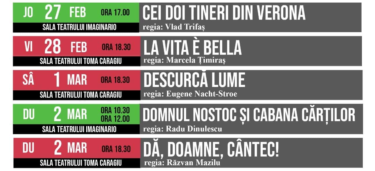 Într-o săptămână în care farmecul iubirii autentice românești se împletește armonios cu emoția sărbătorii Mărțișorului și a primelor zile de primăvară, pe scenele Teatrului „Toma Caragiu” se vor regăsi spectacole care invita publicul de toate vârstele să pătrundă în universuri în care umorul, emoția și visarea vor crea cadrul perfect pentru a celebra aceste momente încărcate de simbolism și tradiție. Cei mici se vor bucura de un spectacol multimedia născut din dorința de a aduce copiii mai aproape de lectură şi de lumea poveştilor, de care tehnologia, la care astăzi au acces aproape nelimitat, a ajuns să îi despartă.
