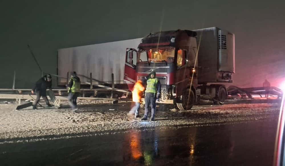 Pe un carosabil parțial acoperit de zăpadă, TIR-ul a derapat, rupând glisiera mediană și intrând pe contrasens.