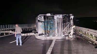 Un TIR s-a răsturnat joi noapte pe autostrada A1, între Sebeş şi Sibiu, blocând complet un sens de mers. Traficul rămâne blocat şi vineri dimineaţă, circulaţia fiind deviată pe Drumul Naţional 1.