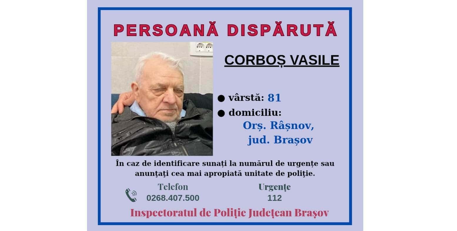 Polițiștii din cadrul Inspectoratului de Poliție Județean Brașov efectuează verificări pentru identificarea unei persoane dispărute, după ce au fost sesizați în dimineața zilei de 21 septembrie a.c. despre plecarea voluntară de la domiciliu, din localitatea Râșnov, județul Brașov, a lui CORBOȘ VASILE, în vârstă de 81 de ani, care nu ar mai fi revenit la adresa de domiciliu până în prezent.