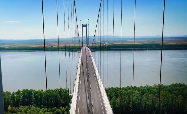 Podul suspendat peste Dunăre este, în momentul de faţă, cea mai mare lucrare de infrastructură din România din ultimii 30 de ani, materializată  prin asocierea a două firme - una din Italia şi cealaltă din Japonia.