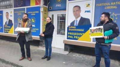 Însoţit de trei colaboratori, parlamentarul a trecut luni mai întâi pe la sediul PNL Prahova, unde, pe lângă semnăturile strânse online în ultima perioadă, a adus, în semn de protest, şi un sac de ciment, alături de un cireş în ghiveci şi o felicitare cu mesajul "Dragă Iulian, odată cu venirea primăverii, omul gospodar plantează copaci. Lăcustele, însă, invadează şi distrug spaţiul verde. Alege ce vrei să fii!". Sub sloganul "Roberta şi dom' Baron, care toarnă-n parc beton", ei au protestat faţă de planurile anunţate de conducerea PNL şi a Consiliului Judeţean Prahova şi susţinute de consilierii municipali liberali, argumentând că obiectivele propuse, precum o sală polivalentă de 16.000 de locuri, un bazin de înot şi un patinoar, vor presupune o suprafaţă betonată uriaşă, în detrimentul spaţiului verde. "Acum, domnul Dumitrescu are de ales între a planta acest copac şi mulţi alţi copaci, sau de a face pe constructorul şi a betona, parţial sau total, Parcul Municipal Vest", a adăugat Mihai Poliţeanu.