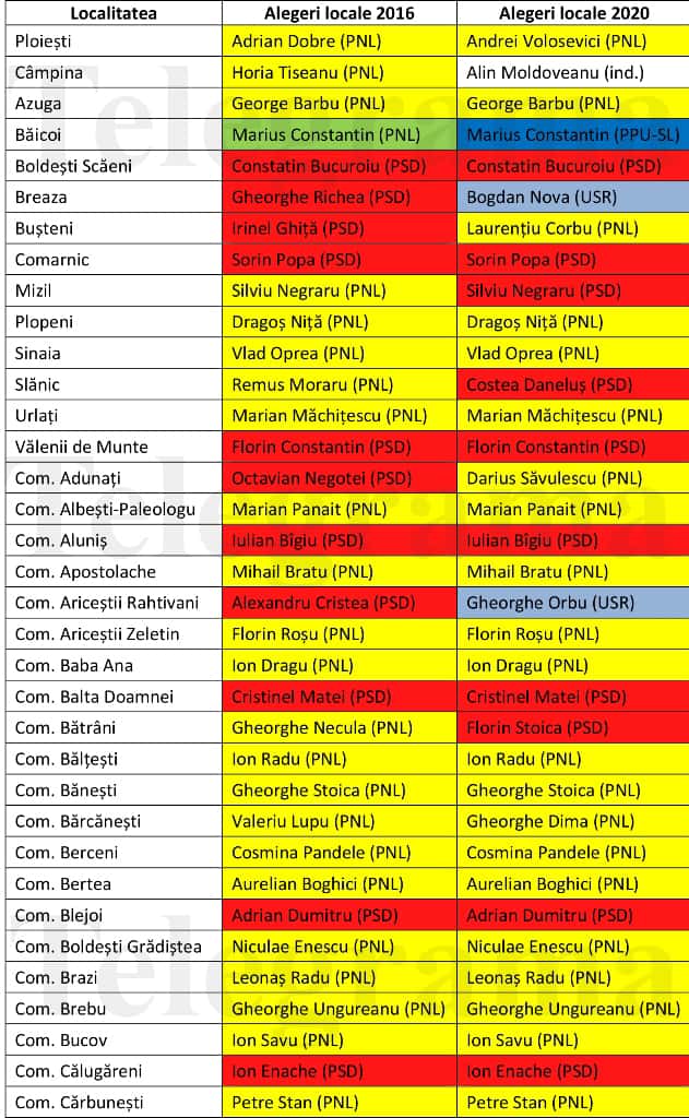 În mandatul 2020 - 2024, PNL va avea primari în Ploiești, Azuga, Bușteni, Plopeni, Sinaia, Urlați, Adunați, Albești-Paleologu, Apostolache, Ariceștii Zeletin, Baba Ana, Bălțești, Bănești, Bărcănești, Berceni, Bertea, Boldești-Grădiștea,Brazi, Brebu, Bucov, Cărbunești, Cerașu, Ciorani, Cocorăștii Mislii, Colceag, Drajna, Dumbrava, Dumbrăvești, Filipeștii de Pădure, Filipeștii de Târg, Florești, Gorgota, Gornet-Cricov, Gura Vadului, Gura Vitioarei, Iordăcheanu, Lapoș, Lipănești, Măgurele, Măneciu, Mănești, Păulești, Plopu, Poiana Câmpina, Predeal Sărari, Provița de Sus, Puchenii Mari, Salcia, Sălciile, Scorțeni, Șirna, Surani, Târgșoru Vechi, Teișani, Tinosu, Valea Doftanei și Vâlcănești.