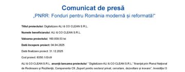 COMUNICAT DE PRESĂ - „PNRR: Fonduri pentru România modernă și reformată!“ - Digitalizare ALI & CO CLEAN S.R.L.