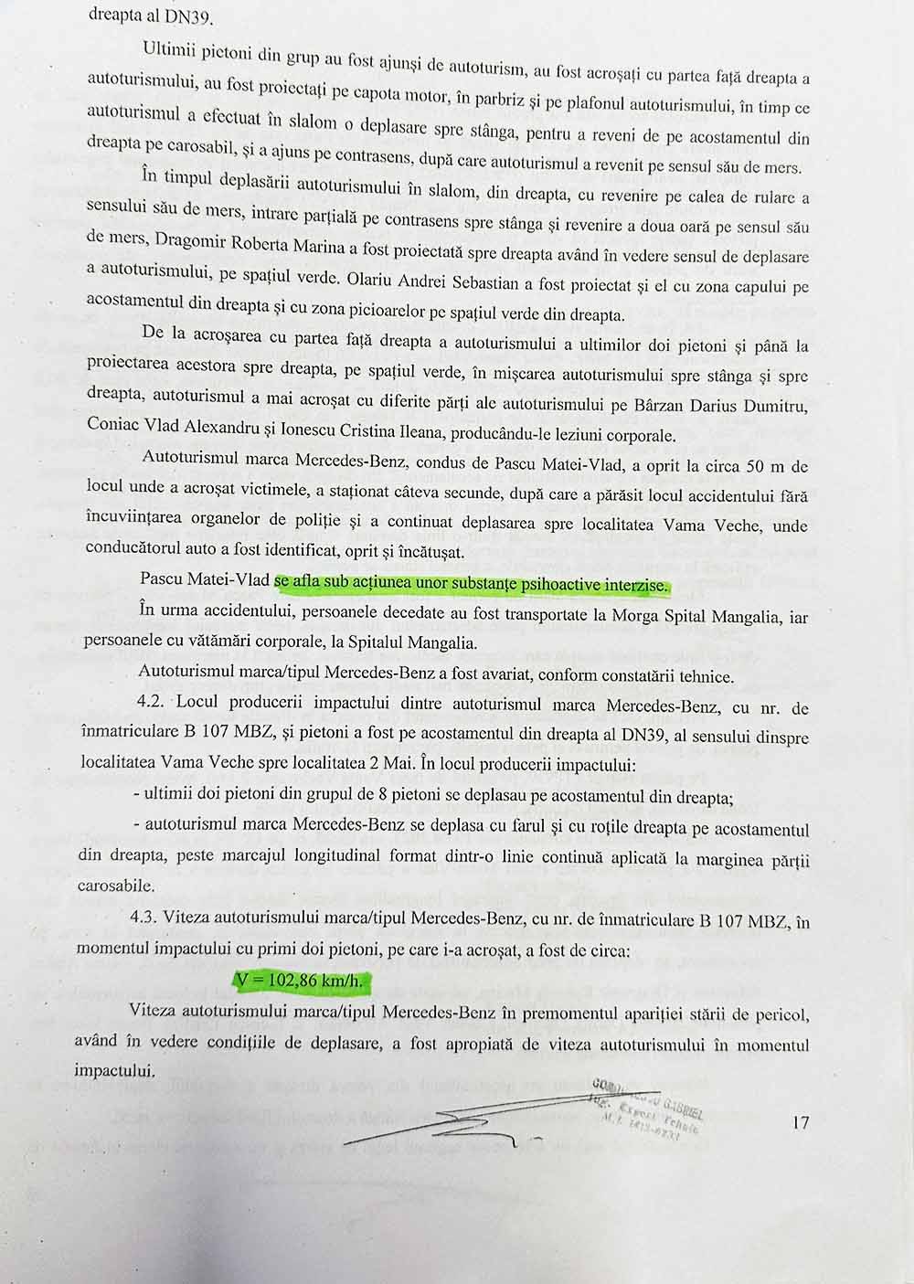 Conform documentului citat de HotNews.ro, expertiza privind dinamica accidentului arată că în momentul în care i-a lovit pe primii doi tineri Vlad Pascu circula cu 102,86 de kilometri la oră.