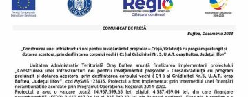 COMUNICAT DE PRESĂ - „Construirea unei infrastructuri noi pentru învățământul preșcolar – Creșă/Grădiniță cu program prelungit și dotarea acestora, prin desființarea corpului vechi ( C1 ) al Grădiniței Nr. 5, U.A.T. oraș Buftea, Județul Ilfov”