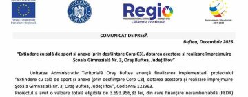 COMUNICAT DE PRESĂ - “Extindere cu sală de sport și anexe (prin desființare Corp C3), dotarea acestora și realizare împrejmuire Școala Gimnazială Nr. 3, Oraș Buftea, Județ Ilfov”