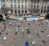 Peste 200 de pantofi de copii, așezați în Piața Universității, ca omagiu adus copiilor morţi în războiul din Ucraina