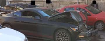 Accident lângă secția de Poliție. Mustang înmatriculat în Brașov, avariat serios după impactul cu un Logan