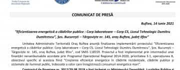 COMUNICAT DE PRESĂ: ”Eficientizarea energetică a clădirilor publice : Corp laboratoare – Corp C5, Liceul Tehnologic Dumitru Dumitrescu”, Șos. București – Târgoviște nr. 145, oraș Buftea, județ Ilfov”
