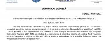 COMUNICAT DE PRESĂ: ”Eficientizarea energetică a clădirilor publice: Școala Gimnazială nr. 3, str. Independenței nr. 52, oraș Buftea, județ Ilfov”