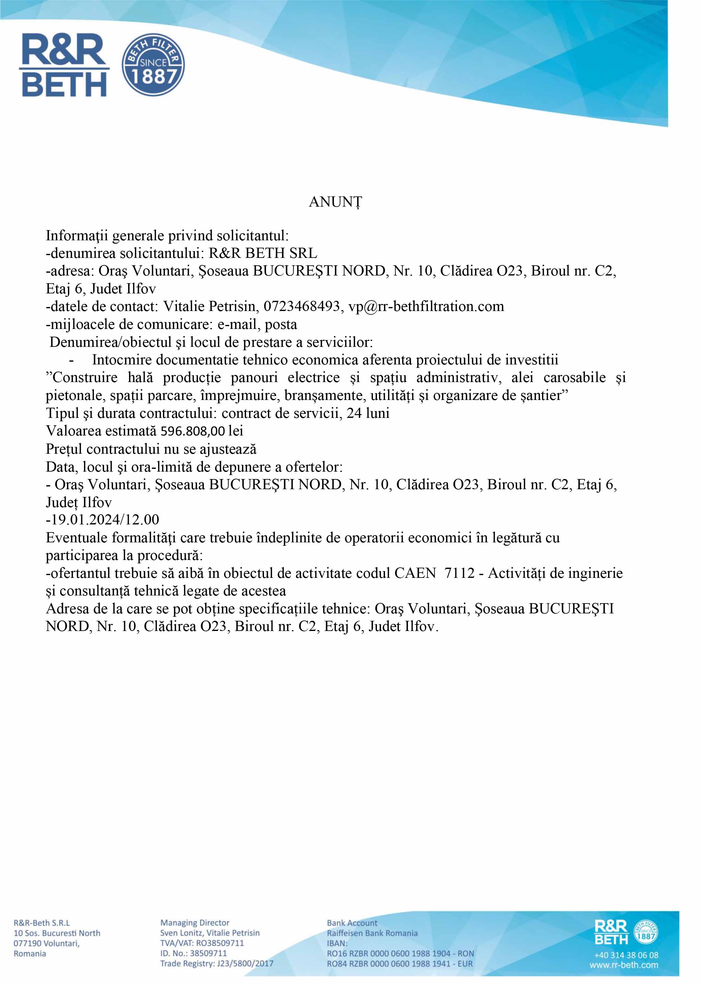 ”Construire hală producție panouri electrice și spațiu administrativ, alei carosabile și pietonale, spații parcare, împrejmuire, branșamente, utilități și organizare de șantier”