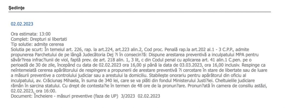 Poliţiştii au reuşit să îl identifice pe autor, iar după audieri, în jurul orei 13, au decis să îl reţină pentru 24 de ore. Deoarece fapta era de necontestat, poliţiştii şi procurorul ştiau că bărbatul trebuie prezentat în faţa unui judecător de drepturi şi libertăţi cu propunere de arestare preventivă. Ședinţa de judecată a fost programată joi la ora 9, dar estimată să înceapă la ora 13, înainte de expirarea ordonanţei. La ora 13 judecătorul de drepturi şi libertăţi de la Judecătoria Dej încă nu venise la muncă.