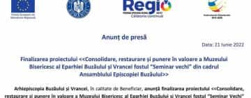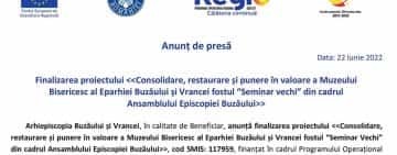 Anunț de presă: Finalizarea proiectului Consolidare, restaurare și punere în valoare a Muzeului Bisericesc al Eparhiei Buzăului și Vrancei fostul “Seminar vechi” din cadrul Ansamblului Episcopiei Buzăului