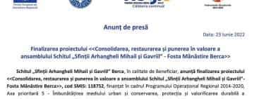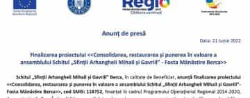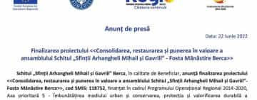Anunț de presă. Finalizarea proiectului: Consolidarea, restaurarea și punerea în valoare a ansamblului Schitul „Sfinții Arhangheli Mihail și Gavriil” - Fosta Mănăstire Berca