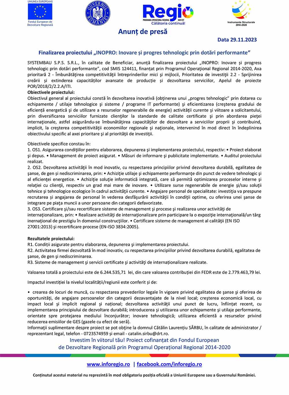 SYSTEMBAU S.P.S. S.R.L., în calitate de Beneficiar, anunță finalizarea proiectului „INOPRO: Inovare și progress tehnologic prin dotări performante”, cod SMIS 124411, finanțat prin Programul Operaţional Regional 2014-2020, Axa prioritară 2 - Îmbunătăţirea competitivităţii întreprinderilor mici şi mijlocii, Prioritatea de investiţii 2.2 - Sprijinirea creării și extinderea capacităților avansate de producție și dezvoltarea serviciilor, Apelul de proiecte POR/2018/2/2.2.A/ITI.