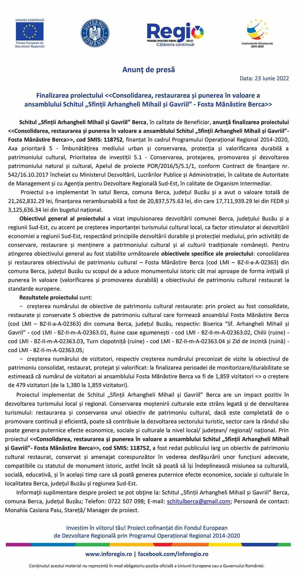Schitul „Sfinții Arhangheli Mihail și Gavriil” Berca, în calitate de Beneficiar, anunță finalizarea proiectului <<Consolidarea, restaurarea și punerea în valoare a ansamblului Schitul „Sfinții Arhangheli Mihail și Gavriil”- Fosta Mănăstire Berca>>, cod SMIS: 118752, finanțat în cadrul Programului Operațional Regional 2014-2020, Axa prioritară 5 - Îmbunătățirea mediului urban și conservarea, protecția și valorificarea durabilă a patrimoniului cultural, Prioritatea de investiții 5.1 - Conservarea, protejarea, promovarea și dezvoltarea patrimoniului natural și cultural, Apelul de proiecte POR/2016/5/5.1/1, conform Contract de finanțare nr. 542/16.10.2017 încheiat cu Ministerul Dezvoltării, Lucrărilor Publice și Administrației, în calitate de Autoritate de Management și cu Agenția pentru Dezvoltare Regională Sud-Est, în calitate de Organism Intermediar.