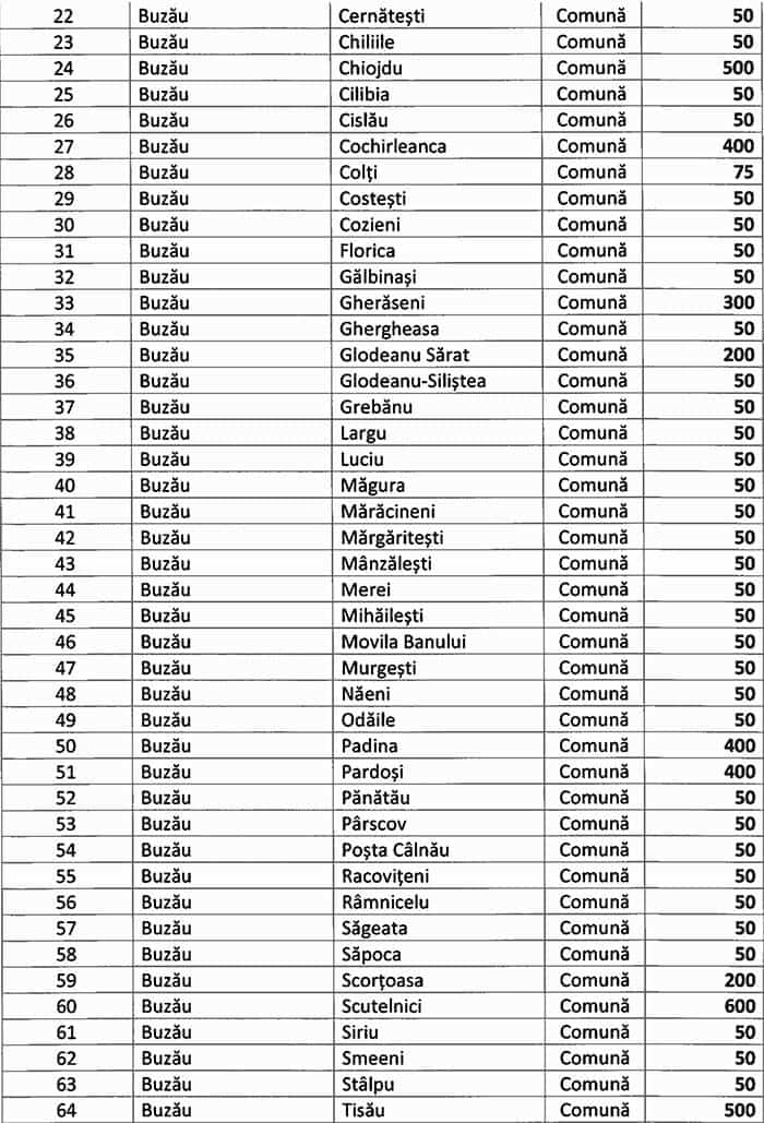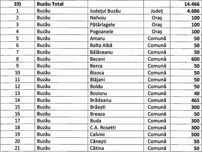 Suma totală care i-a revenit Buzăului este de 14.466.000 de lei, conform anexei Hotărârii de Guvern adoptate săptămâna trecută, adică mai puțin 10% din totalul solicitat insistent de autoritățile din județ, așa cum reiese chiar din nota de fundamentare atașată proiectului de act normativ: “Prin adresele comune ale Instituției Prefectului – Județul Buzău nr. 12.451/04.10.2021 și ale Consiliului Județean Buzău nr. 15.182/4.10.2021 a fost solicitată suma de 171.765 mii lei din Fondul de rezervă bugetară aflat la dispoziția Guvernului, prevăzut în bugetul de stat pe anul 2021, bugetelor locale a unităților administrativ-teritoriale din județul Buzău. La Instituția Prefectului Județul Buzău s-au înregistrat solicitări de la unitățile administrativ-teritoriale din județul Buzău, care au semnalat faptul că întâmpină dificultăți financiare în ceea ce privește asigurarea cheltuielilor de funcționare până la sfârșitul anului 2021. Având în vedere cele prezentate mai sus, pentru finanțarea cheltuielilor de funcționare ale UAT-urilor se propune alocarea sumei de 171.765 mii lei, din Fondul de rezervă bugetară la dispoziția Guvernului, prevăzut în bugetul de stat pe anul 2021 bugetelor locale ale unor unități administrativ-teritoriale din județul Buzău, conform anexei la prezenta notă”.