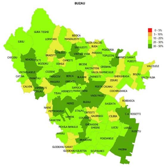 Cea mai recentă raportare publicată de autorități arăta că, la data de 5 februarie, cea mai mare rată de vaccinare se înregistra în municipiul Buzău (43,34%), iar cea mai mică la Râmnicelu, unde doar 11,78% din populație s-a vaccinat cu cel puțin o doză, la mai mult de un an de la demararea campaniei de imunizare anti-Covid.