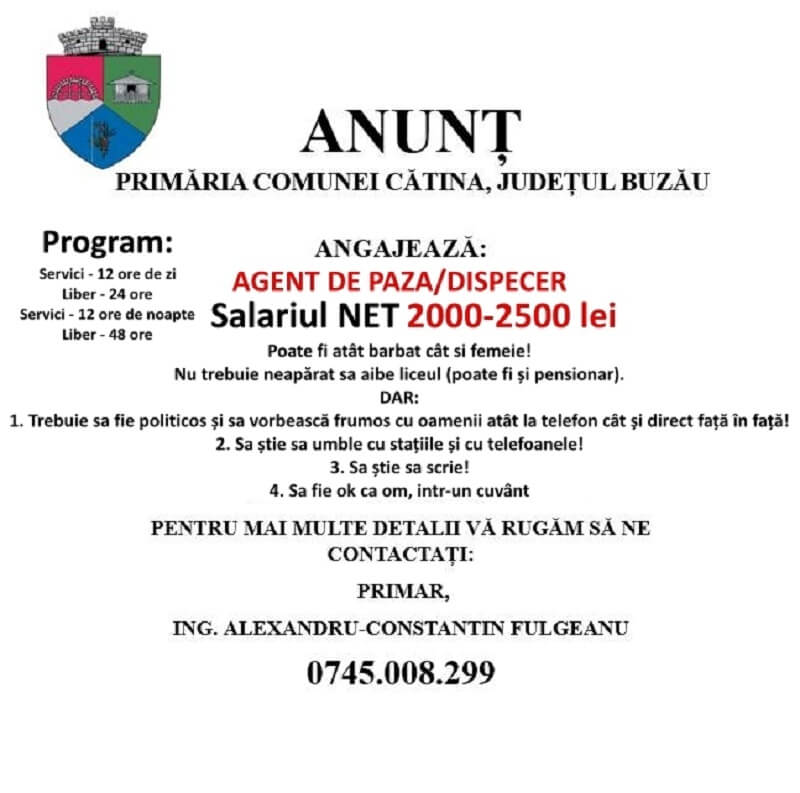Anunțul de recrutare a fost publicat pe pagina de Facebook a Primăriei Cătina și este semnat de primarul Alexandru Constantin Fulgeanu. Este căutată, așadar, o persoană, care poate fi inclusiv din rândul pensionarilor, pentru postul de agent de pază/dispecer. Una dintre condiții este să "aibe" liceul și "să știe să scrie" (spre deosebire de autorul postării, ar fi putut adăuga).