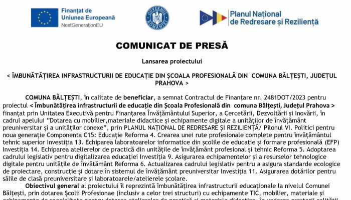 COMUNA BĂLȚEȘTI | COMUNICAT DE PRESĂ | ÎMBUNĂTĂȚIREA INFRASTRUCTURII DE EDUCAȚIE DIN ȘCOALA PROFESIONALĂ DIN COMUNA BĂLȚEȘTI, JUDEȚUL PRAHOVA