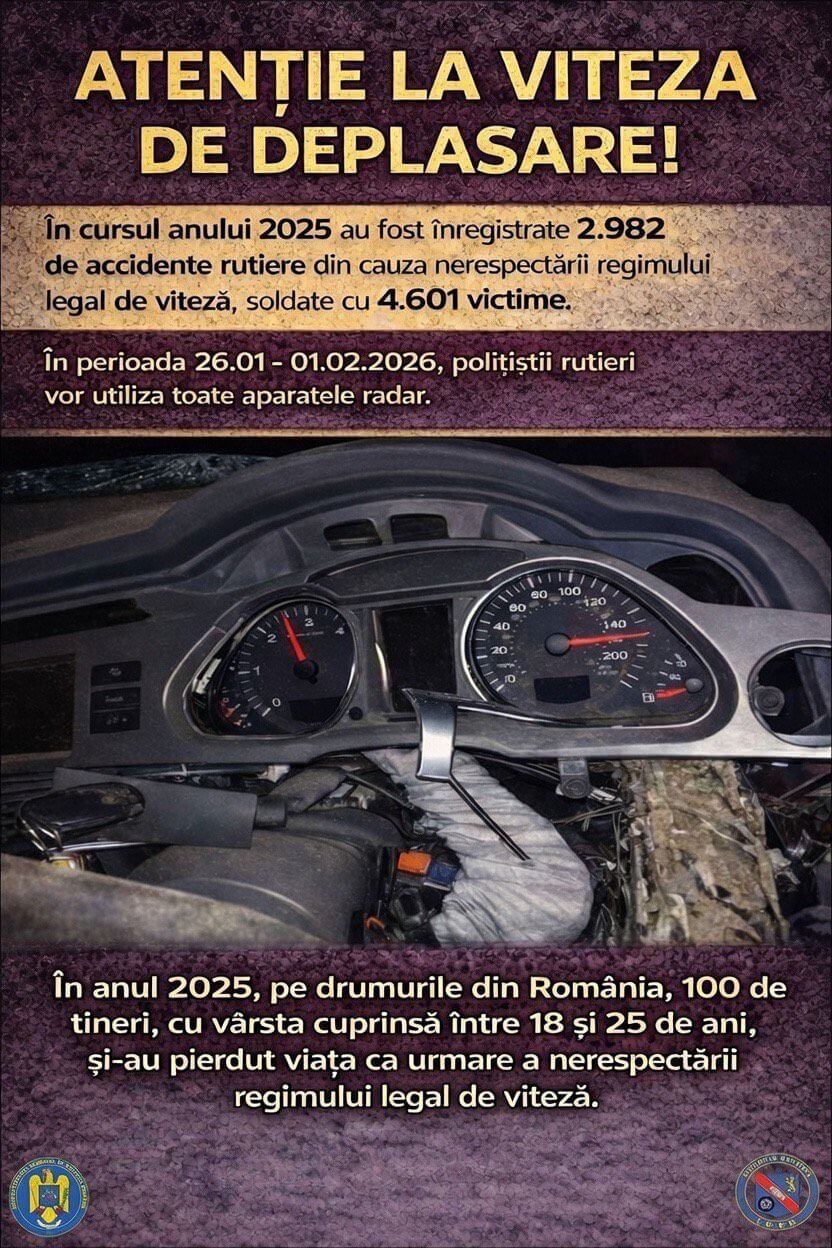 De asemenea, în cursul zilei de astăzi, 29 ianuarie, în intervalul orar 14:00-18:00, polițiștii vor desfășura o altă acțiune, cu scopul de a descuraja viteza excesivă și de a crește gradul de disciplină în trafic.